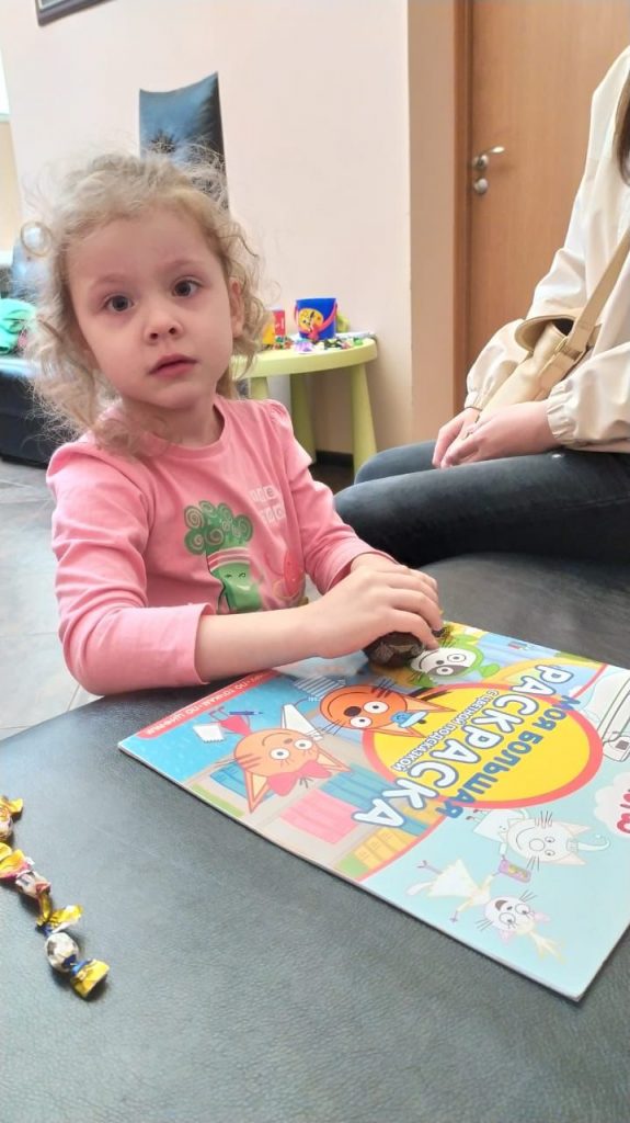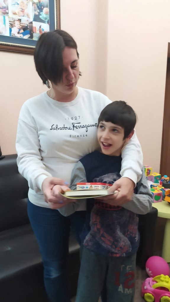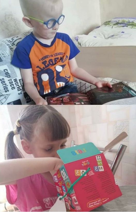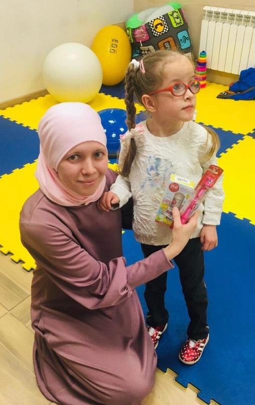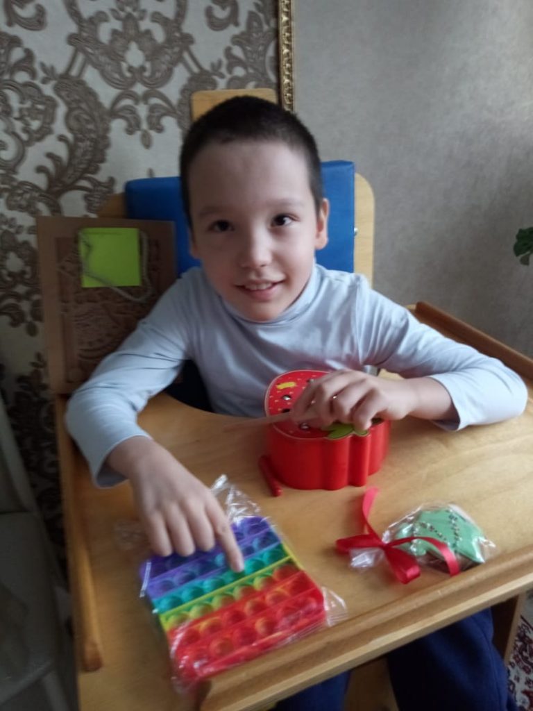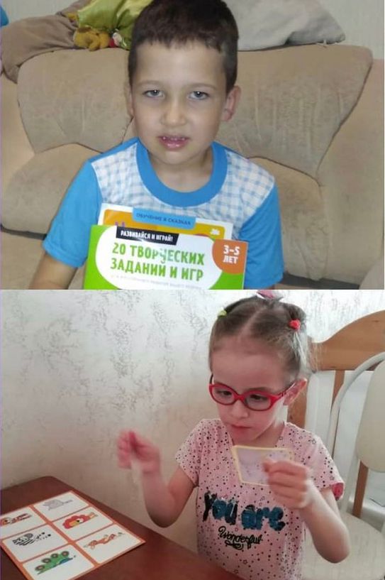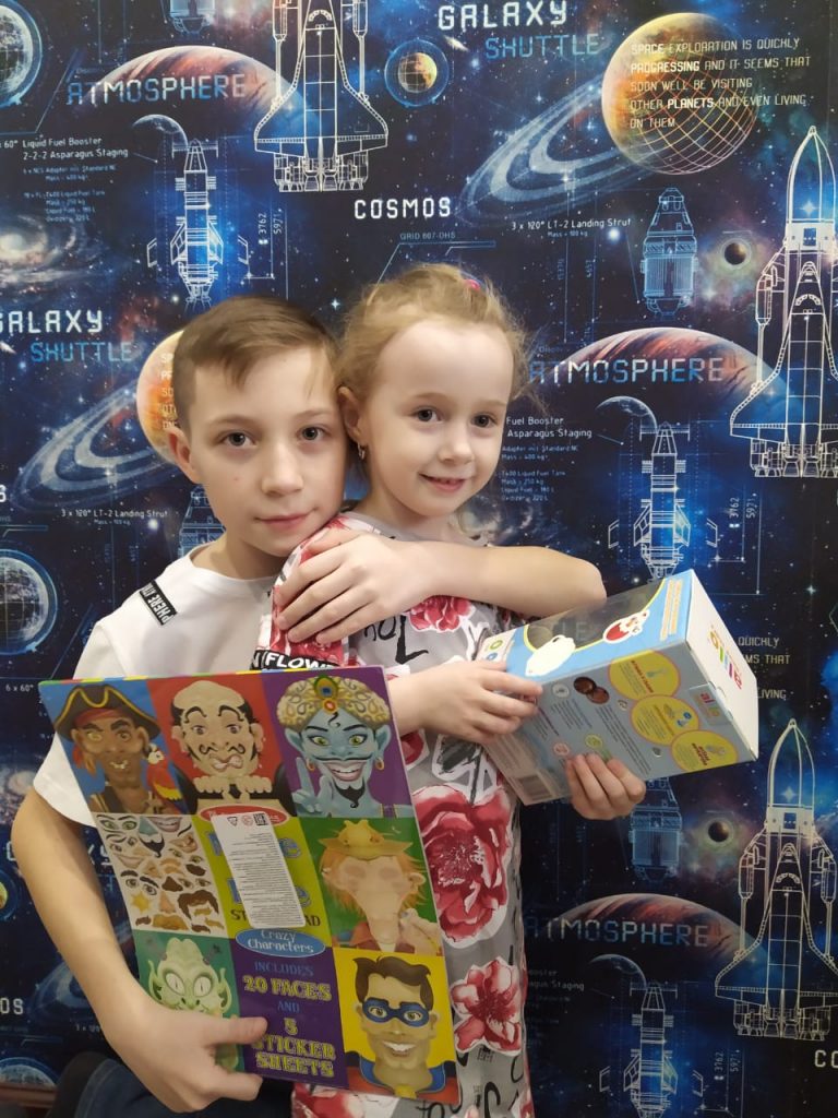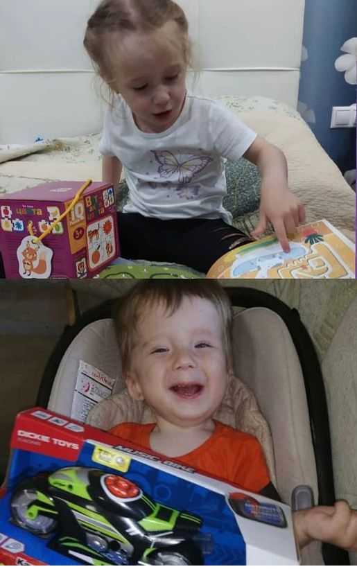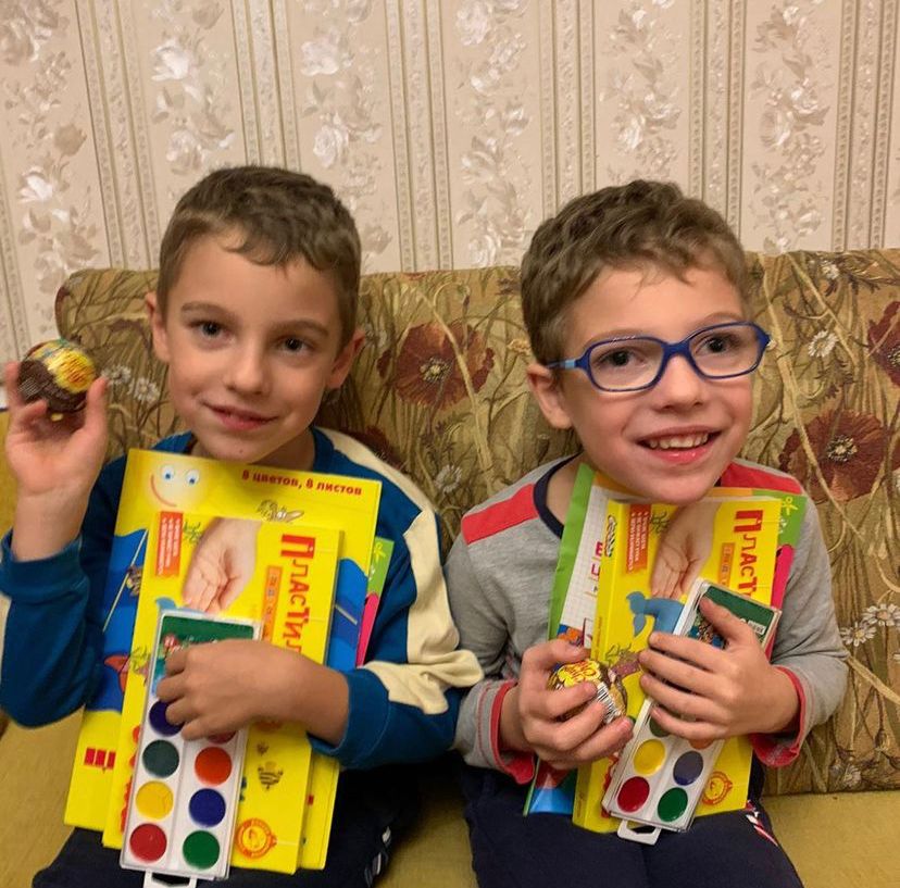 Камила и Камиль, дети из г. Ульяновска. Проучили небольшие презенты от нашего фонда. Интересную книгу с наклейками и музыкального зайчика Алило.