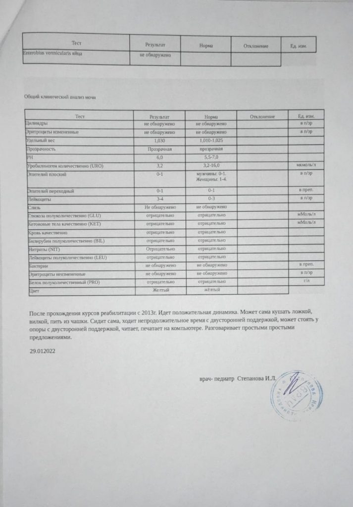 Сейчас спустя 9 лет после болезни Вика добилась многого, несмотря на спастический тетрапарез. Учится в 4 классе, в школу ей хочется возвращаться. Сейчас она уже может самостоятельно сидеть на стуле, ходить с поддержкой, говорить фразами и небольшими предложениями, любит слушать музыку и подпевать, читает, в школе печатает на ноутбуке, может кушать самостоятельно вилкой и ложкой, может пить из чашки.
