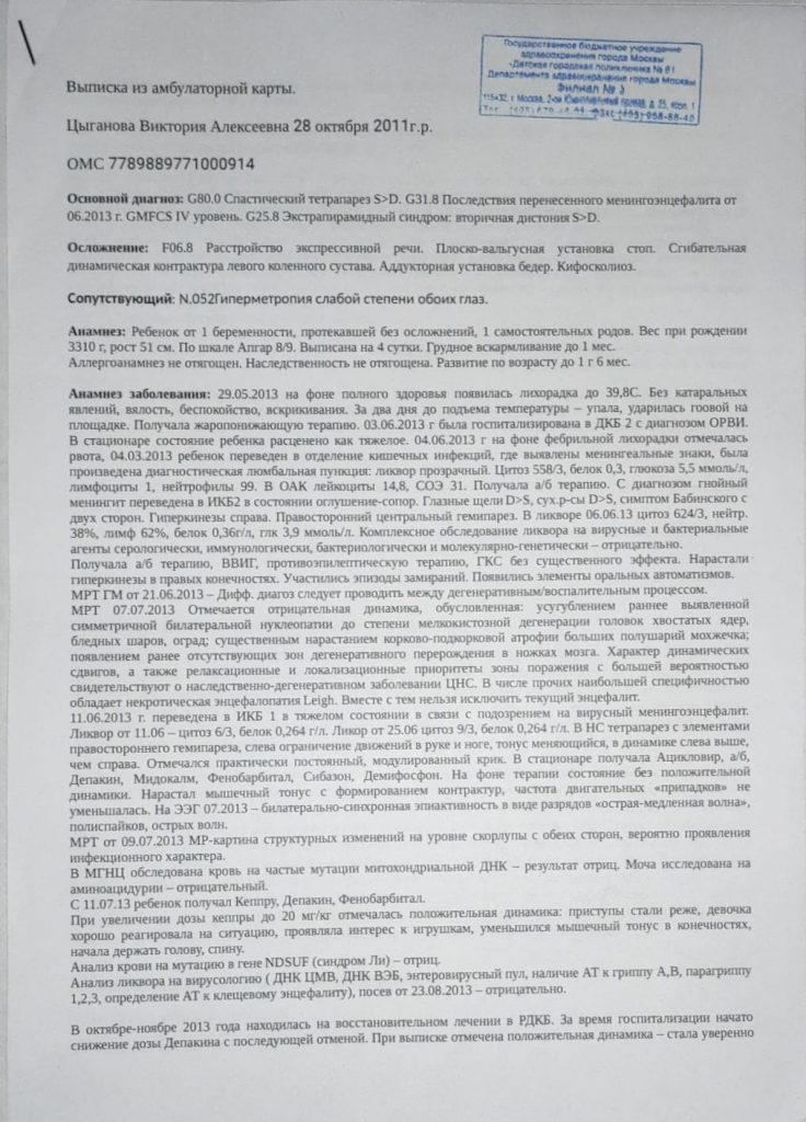 03.06.2013 я решила госпитализироваться в больницу, нас отвезли в больницу им. Св. Владимира (сейчас ее называют Русаковской больницей). Там нас положили в ЛОР-отделение, поставив диагноз ОРВИ и реакция на прорезывание зубов. Пролежав двое суток, состояние не улучшилось, становилось только хуже, она практически все время спала, не ела. Ее стало рвать. начали обследовать: УЗИ, рентген, но ничего не обнаружили. Пока нас водили по коридорам больницы, один профессор проверил ригидность мышц, моя дочка закричала от боли. Нас сразу перевели в инфекционное отделение, подписав бумаги на проведение люмбальной пункции, дочку забрали. Минуты проведенные в коридоре, пока ее не было казались вечностью. Спустя время ее вынесли с трубкой из носа, у меня все тело сжалось. Мы вернулись в отделение, когда результат анализов был готов, нам сообщили, что у Вики менингит и нас переводят в другую больницу. Нас перевели в ИКБ№2, там мы находились с 05.06.-11.06.2013. Там сначала начали лечить, а потом взяли анализы на посевы, результат оказался отрицательным. 11.06. нас перевели в ИКБ №1, двое суток дочка лежала одна в реанимации. Когда 13.06.13 меня пустили туда, т к нас решили перевести в отделение, Вика лежала привязанная к кроватке и стонала от болей. Я не знаю как такой маленький организм смог все выдержать и пережить, от болей ей кололи реланиум три раза в сутки, который оказывал действие на 2-3 часа, это время она спала. Потом просыпалась и опять стонала. там мы находились до 12.08.2013.